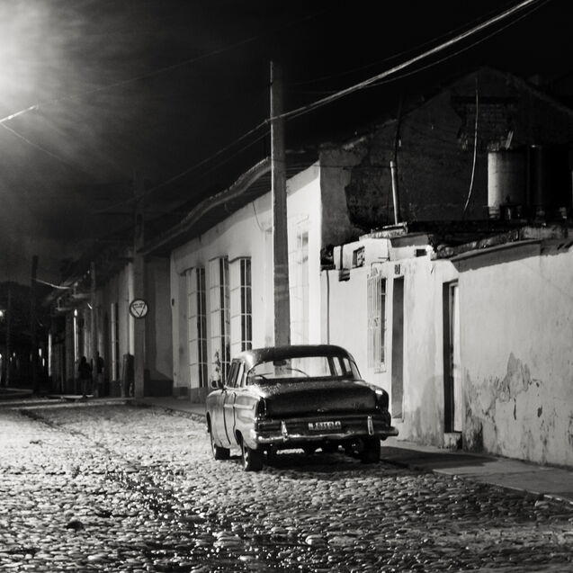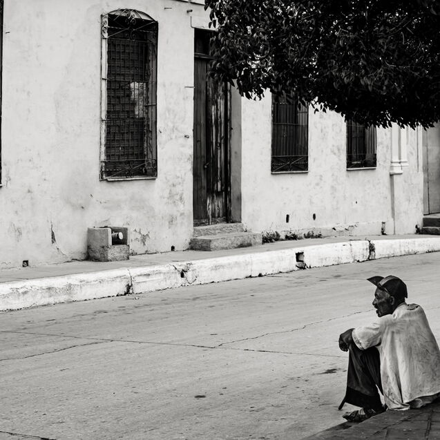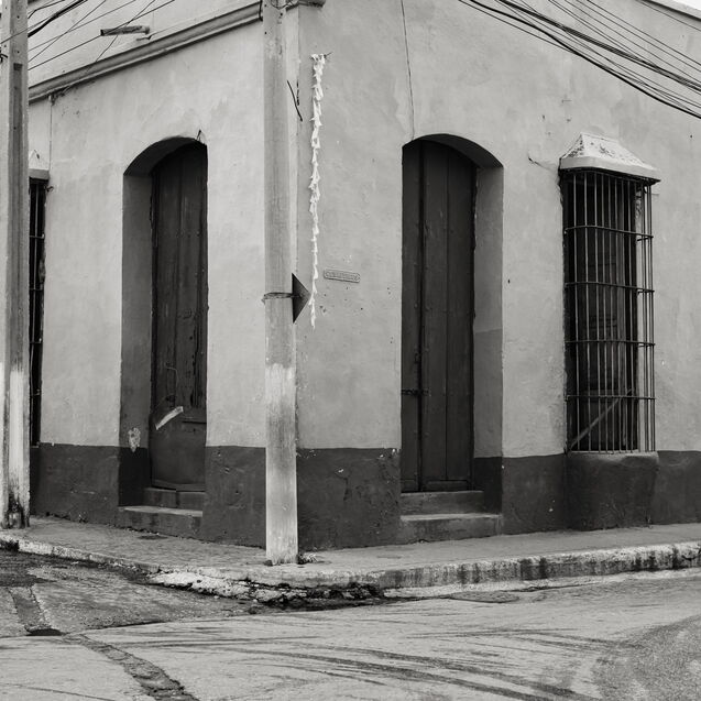 ¶ Sosehr die farbige Buntheit auf den ersten Blick beeindruckt, kann sie nicht darüber hinweg täuschen, daß es auch eine andere Seite des Lebens in Trinidad gibt, – dann, wenn die Lichter aus sind, die Sonne nicht mehr ganz so hell die bröckelnden Fassaden bescheint und sich eine gewisse Tristesse über die Szenerie legt. Diese Stimmung in Bildern festzuhalten, dazu eignet sich die Schwarz-Weiß Darstellung nun einmal besser.